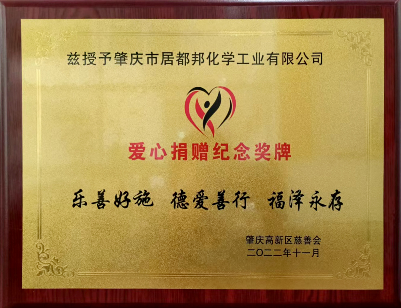 11月16日,“奉獻(xiàn)愛(ài)心力量,彰顯企業(yè)擔(dān)當(dāng)”,肇慶市高新區(qū)愛(ài)心慈善會(huì),為肇慶市居都邦化學(xué)工業(yè)有限公司授予《愛(ài)心捐贈(zèng)紀(jì)念獎(jiǎng)...